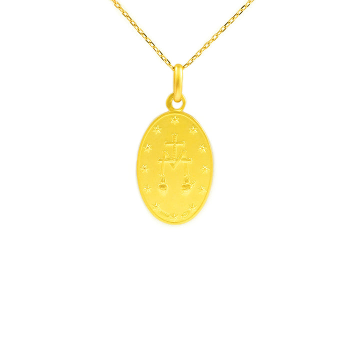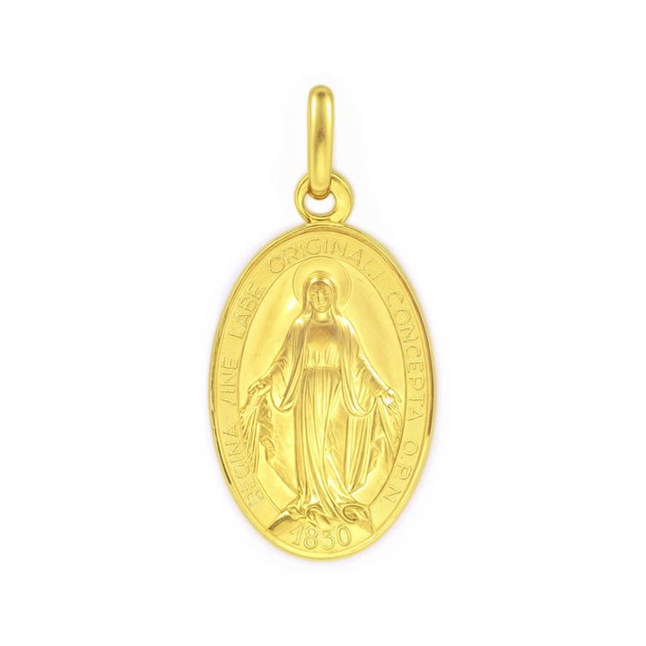 Discover the beauty and spirituality of our Large 18K Yellow Gold Miraculous Medal. This exquisite accessory, meticulously designed in a size of 21 x 14 mm, combines a matte and shiny finish that enhances its elegance and meaning. With a classic and timeless design, this medal is perfect for both everyday wear and special occasions, making it an essential piece for your jewelry collection.