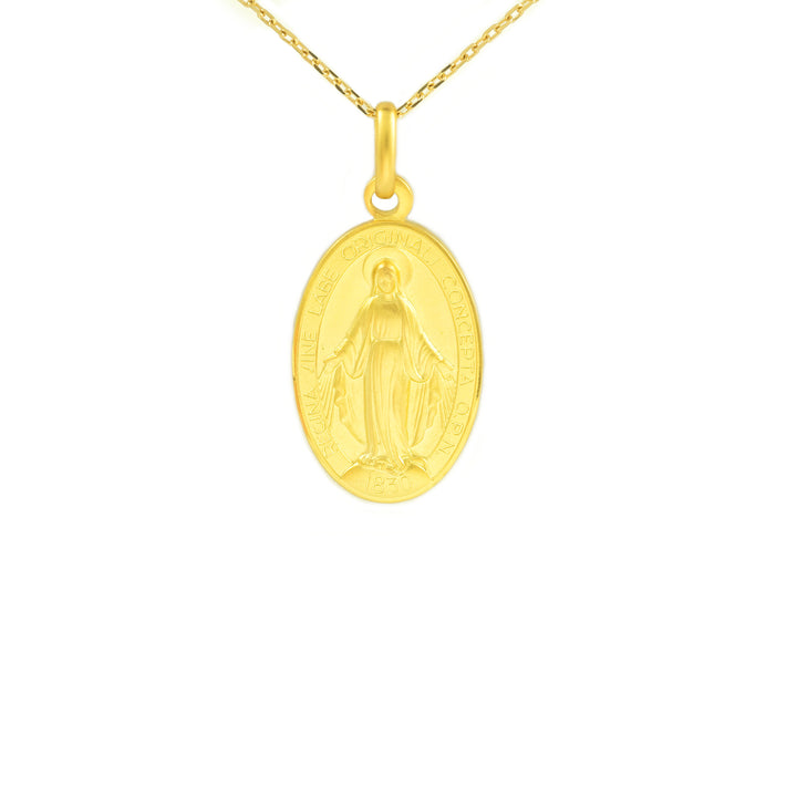 The high-quality yellow gold used in this medal ensures durability and a shine that stands out with every movement. The representation of the Miraculous Virgin is not only a symbol of faith but also a style statement that complements any outfit. Gift this meaningful accessory to a loved one or treat yourself to a piece of jewelry that will never go out of style.