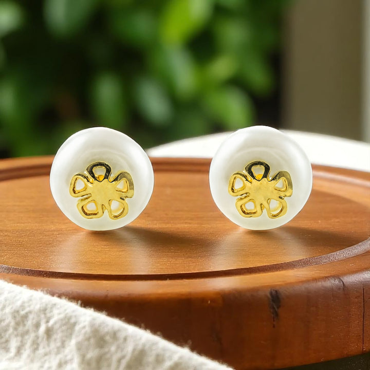 9ct Yellow Gold Flower Natural Pearl Button Shine Girls Earrings