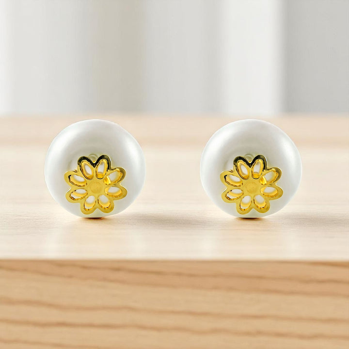 9ct Yellow Gold Flower Natural Pearl Button Shine Girls Earrings