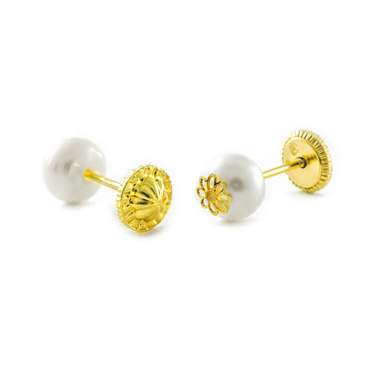Pendientes Niña oro Amarillo 9K Flor Perla Natural Botón Brillo