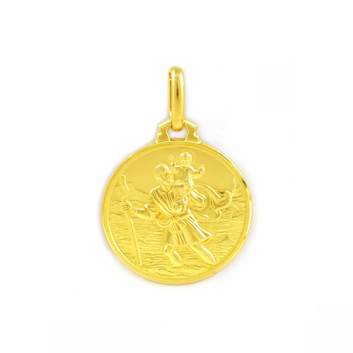 Fabricada en oro amarillo de 9 quilates, esta medalla exhibe un acabado mate y brillante que resalta su belleza única. La representación de San Cristobal, conocido como el santo de los viajeros, añade un toque especial, ofreciendo no solo un accesorio, sino también un mensaje profundo de seguridad y guía espiritual. Además, su tamaño compacto de 12 x 12 mm permite combinarla fácilmente con otras joyas o llevarla sola para un estilo más minimalista.