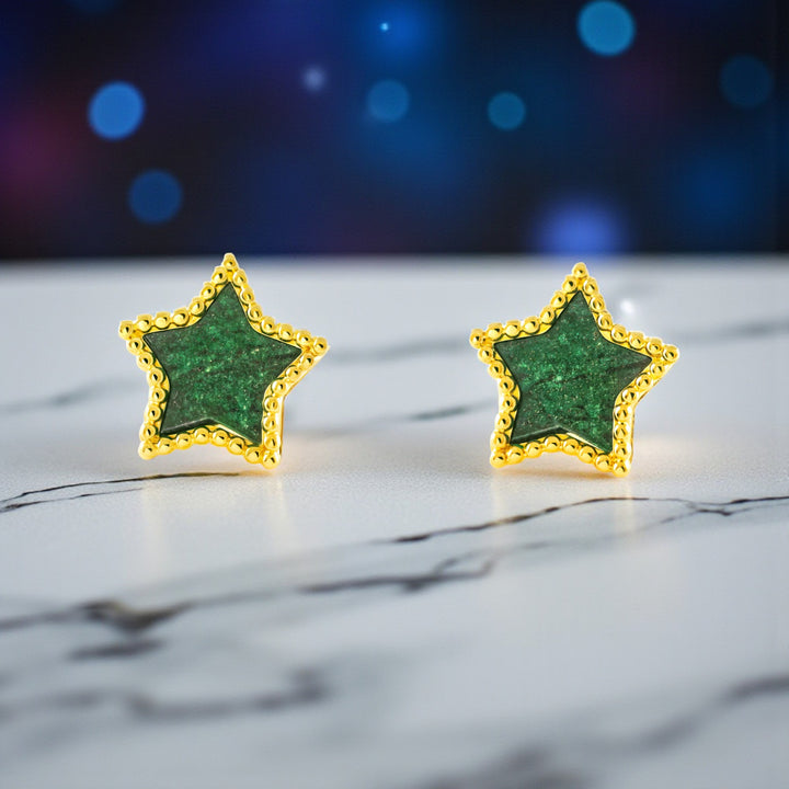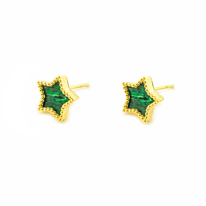 Pendientes Mujer oro Amarillo 9K Estrella Piedra Malaquita Verde Brillo y Textura