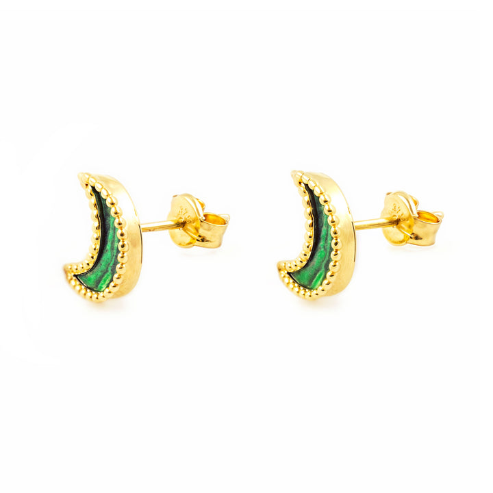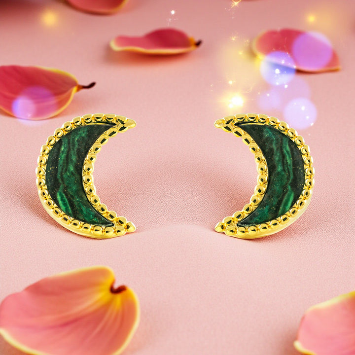 Pendientes Mujer oro Amarillo 9K Luna Piedra Malaquita Verde Brillo y Textura