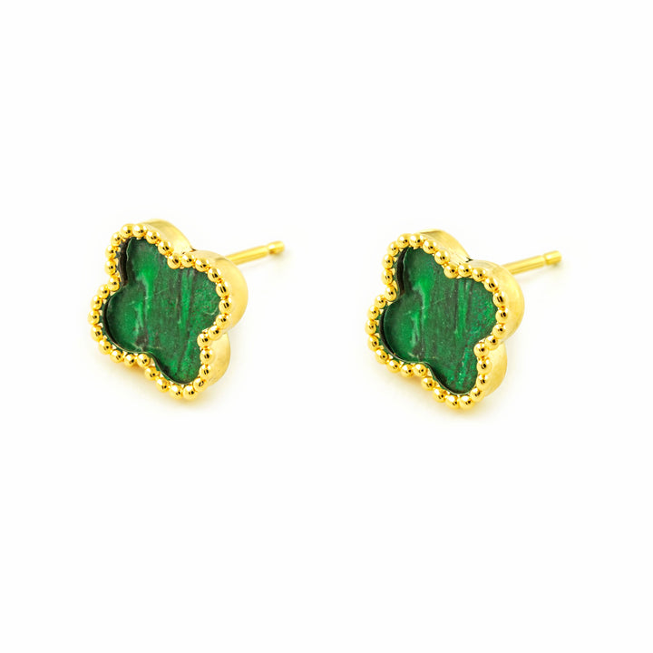 Pendientes Mujer oro Amarillo 9K Trébol Piedra Malaquita Verde Brillo y Textura