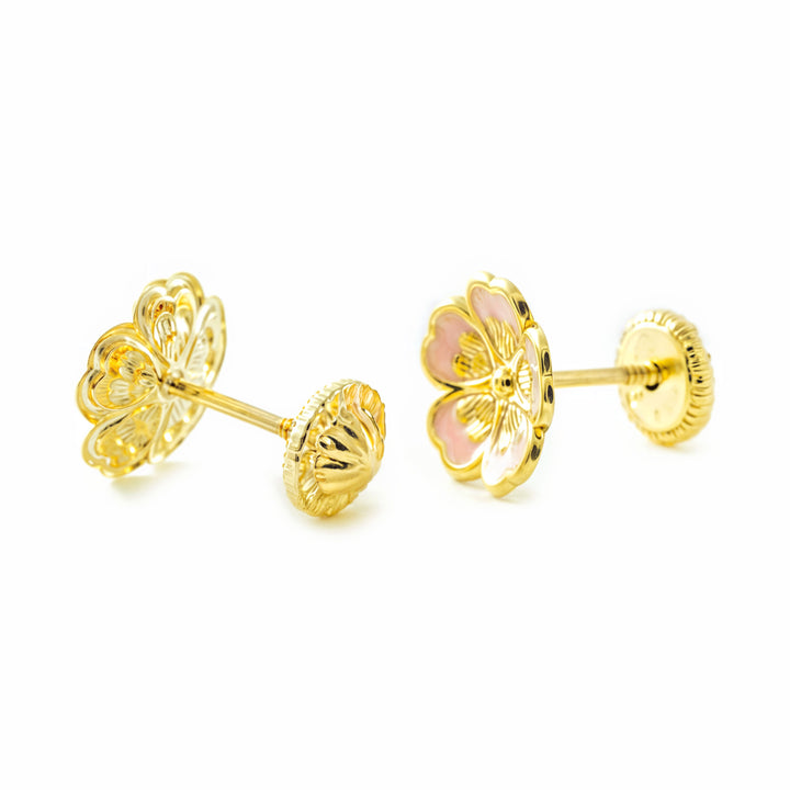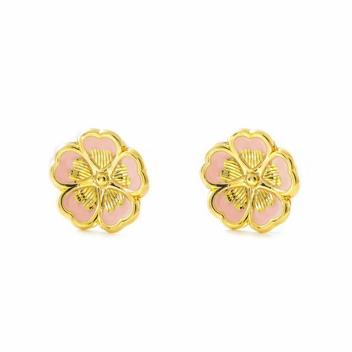 Pendientes Niña Mujer oro Amarillo 9K Flor Esmalte Rosa Brillo y Textura