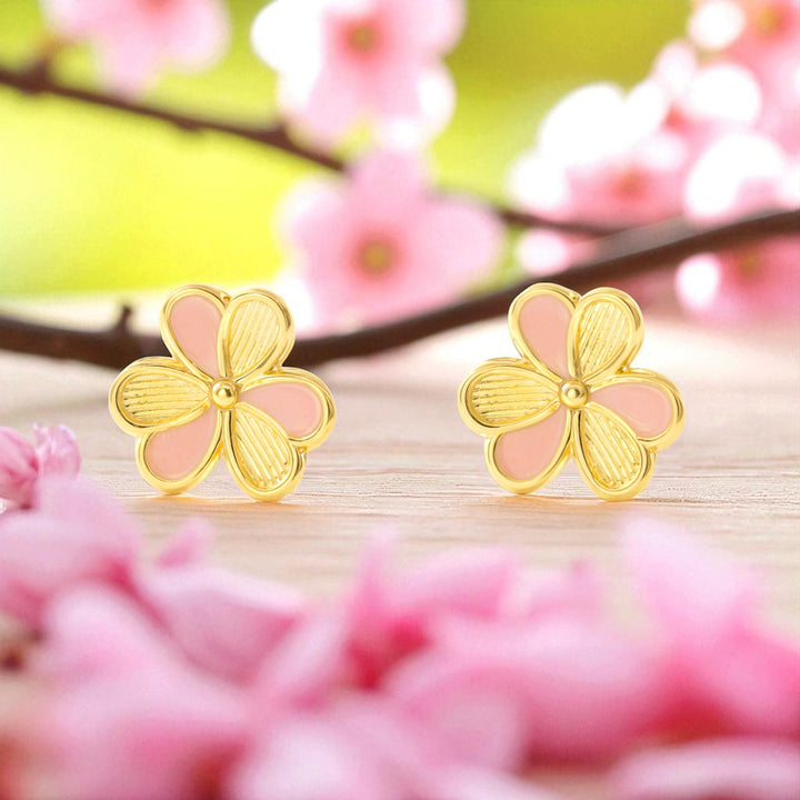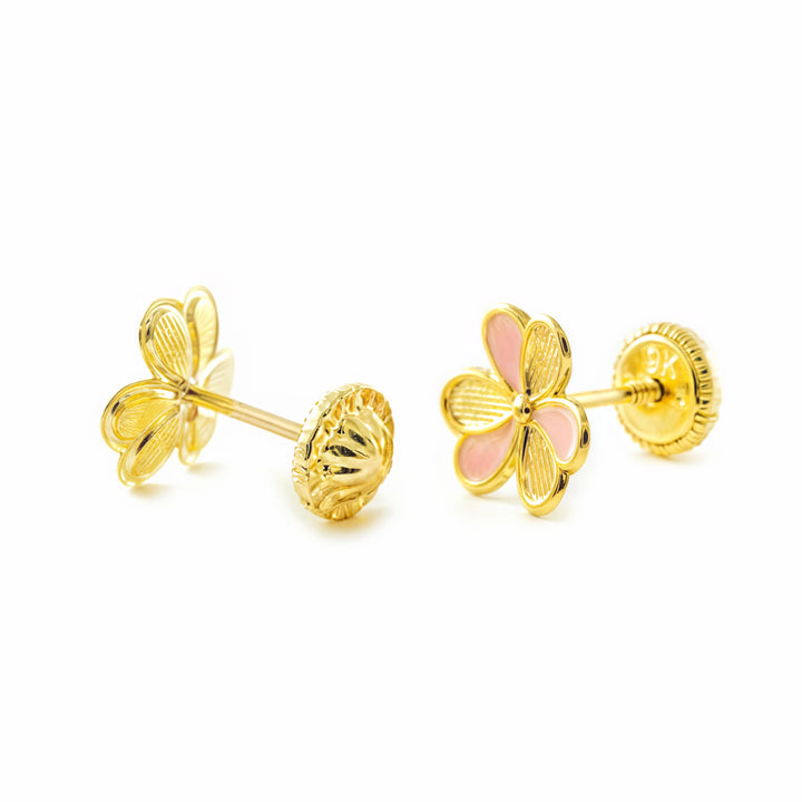 Pendientes Niña Mujer oro Amarillo 9K Trébol Esmalte Rosa Brillo y Textura
