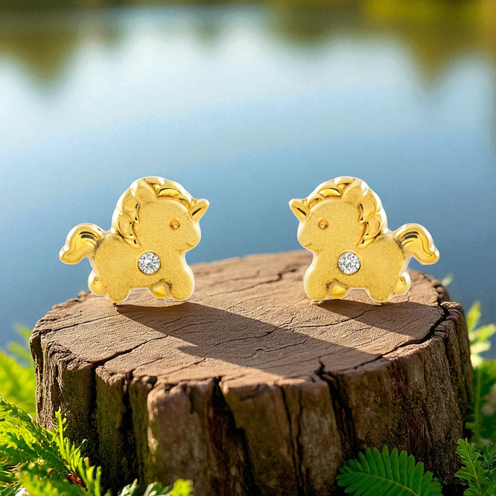 Descubre la magia y ternura de los Pendientes para Niña en oro amarillo 9K con forma de unicornio, una joya encantadora que combina la fantasía infantil con la elegancia del oro. El diseño único de unicornio, adornado con piedra circonita, aporta un toque de brillo y color, ideal para las más pequeñas que sueñan con mundos mágicos.